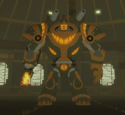The Goliath is the first boss introduced in Boss Raids. It is a Battle Automaton machine created by the Warsmiths. It consists of heavy armor plating and dual cannons on top of it, a rocket hand on its left hand and a flamethrower on its right, a Goliath gaze helmet to shoot powerful lasers, and a back component hatch to summon Goliath Minions. The Goliath has a total of ten attacks.